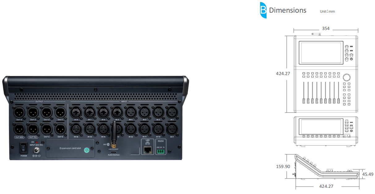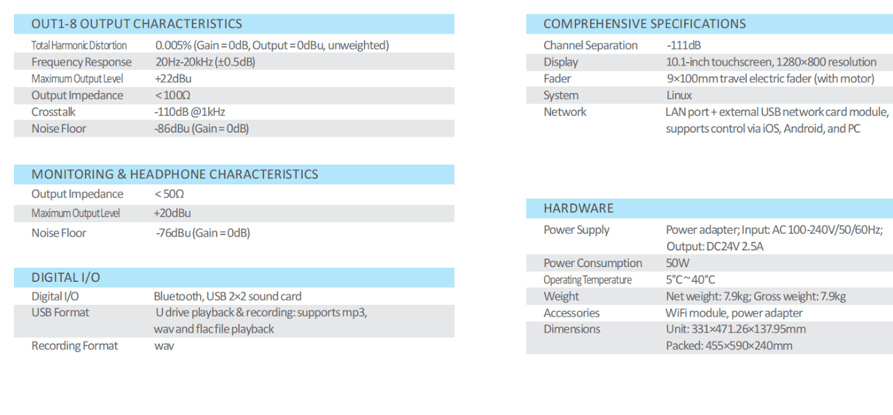 Digital expansion: 4 optional 16×16 AES67 / 16×16 sound card / HMLNK ports (16×16 Dante expansion for original accessories);