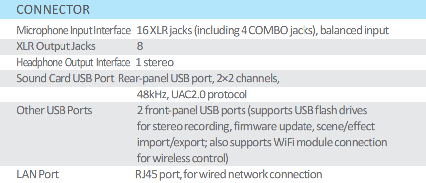 Physical Inputs (20 total): 16 XLR mic inputs (4 COMBO), 2-channel USB sound card/Bluetooth (selectable), stereo USB flash drive playback;