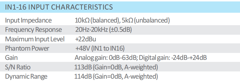 Input Channels: 48V phantom power, analog/digital gain, phase