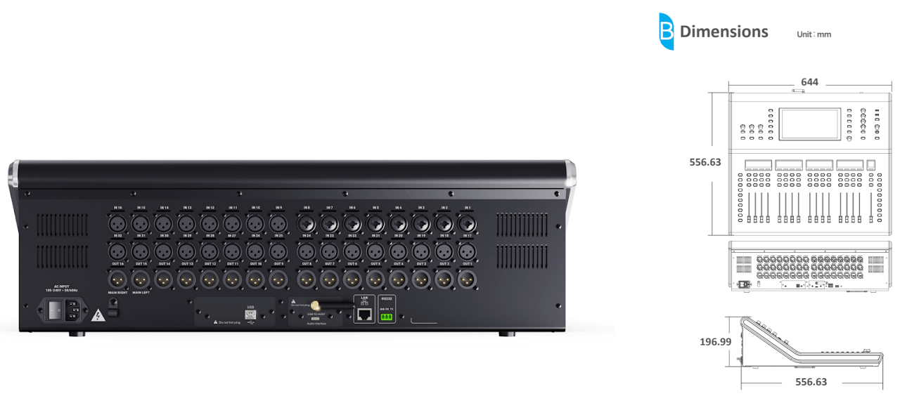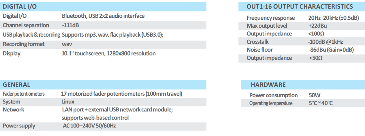 Built-in 2X2 audio interface; supports 2-track audio recording/playback;100 presets for scenes, parametric EQ, effects, noise gates, compressors, GEQ; with save/recall functions;