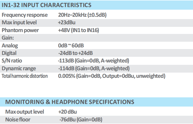 36 physical inputs total: 32 XLR analog channels with preamps (8 COMBO ports included), 2-channel USB audio interface/stereo Bluetooth (selectable), 1 stereo USB playback;