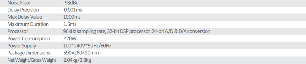Each input/output includes gain, delay, phase control & mute:Max delay: 1000ms; units: ms/m/ft; steps:×0.001/×0.01/×0.1/×1/×10;