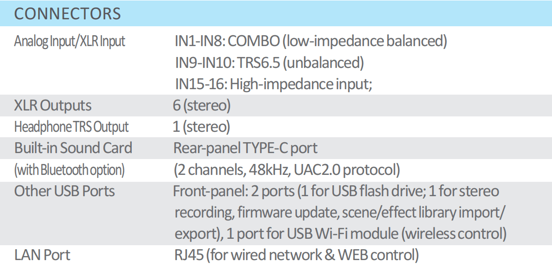 20 physical signal inputs: 8 balanced analog (XLR combo, mic preamps), 8 balanced analog (TRS 6.5), 1 stereo USB playback, 1 stereo Bluetooth/Type-C sound card;