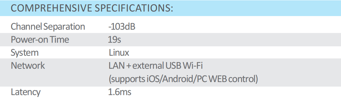 Digital Gain, phase adjustment, 0-1000ms delay, pan/balance control, level adjustment, channel label customization, 4-band parametric EQ (selectable modes: parametric, high-shelf, low-shelf, high-pass filter), high-pass filter, noise gate, compressor;