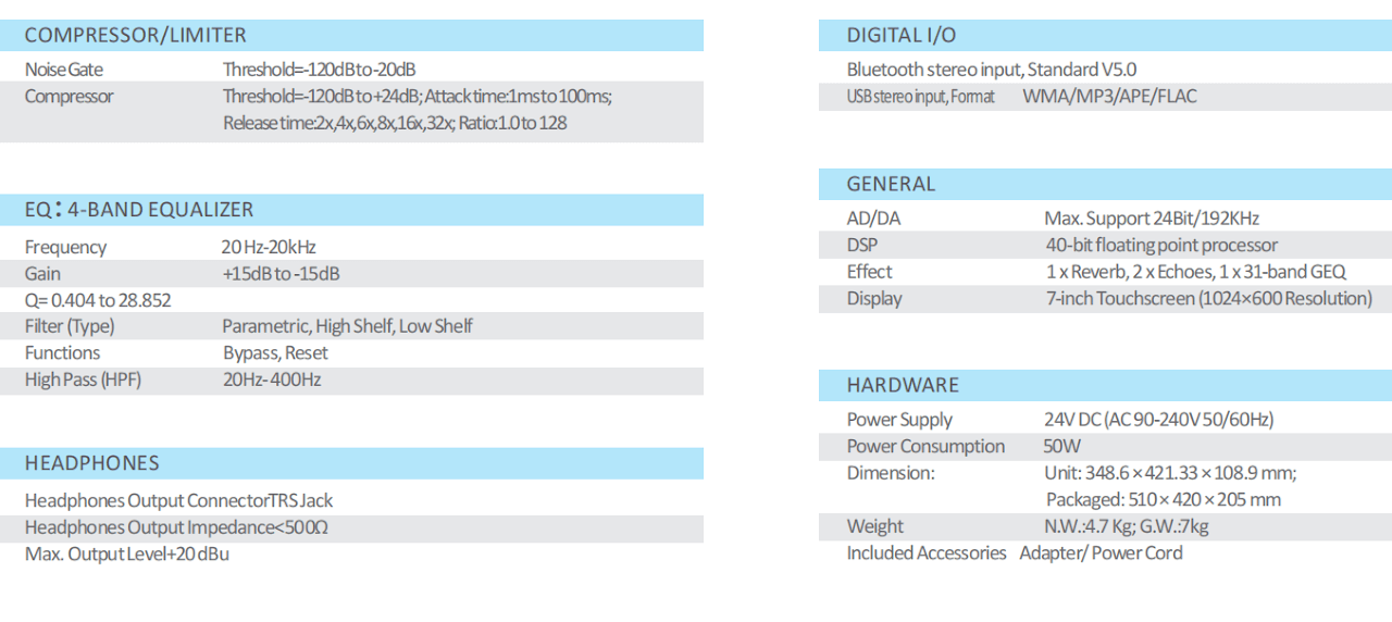 1 x 31-band GEQ (Graphic Equalizer) on inputs;