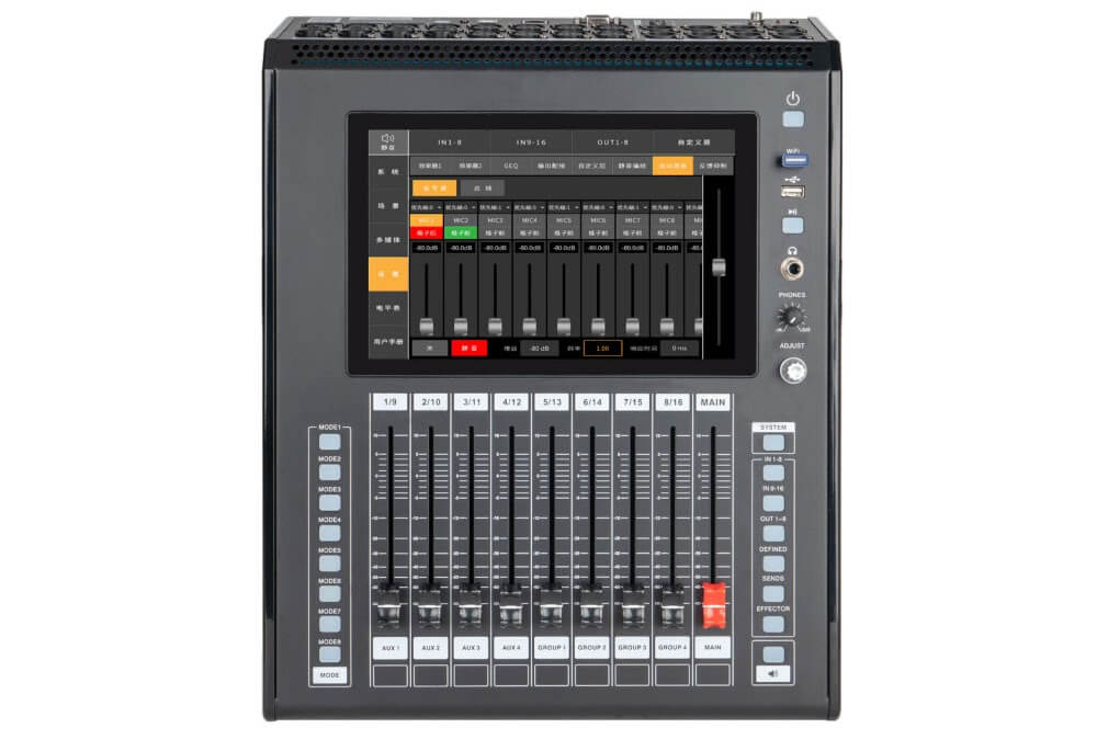 Analog input channels: Gain, noise gate, compressor, phase, 48V phantom power, pan, high-pass filter, 4-band EQ, 200ms delay;