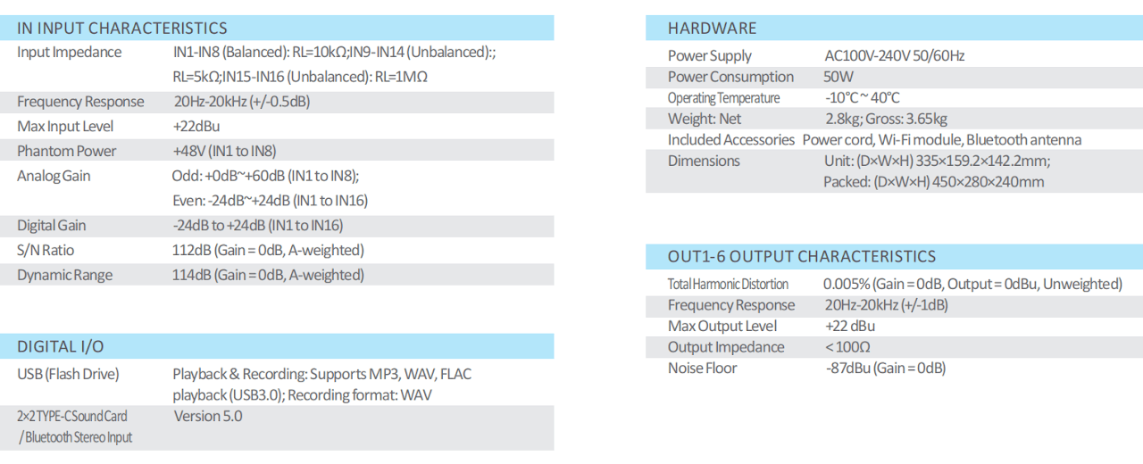 Supports Bluetooth/2×2 Type-C sound card & USB music playback, scene import/export, and device updates;